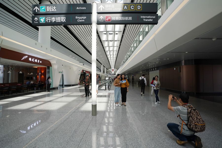 Passengers pose for photos at the terminal of Daxing International Airport in Beijing, capital of China, Sept. 25, 2019. (Xinhua/Ju Huanzong)