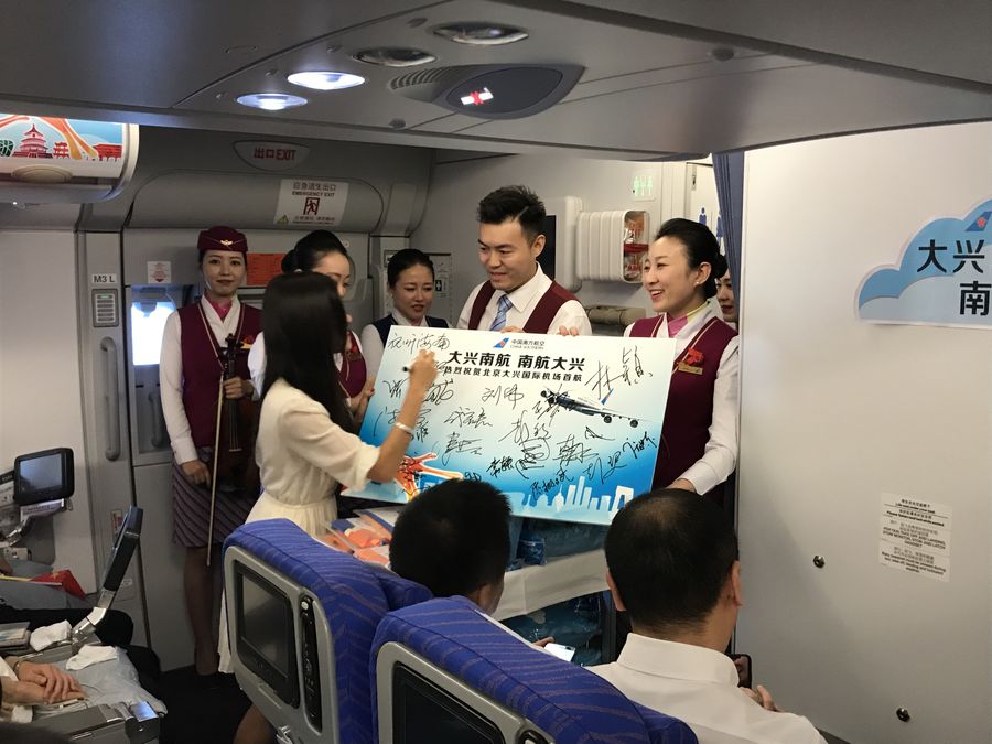 A passenger signs on a board inside the China Southern Airlines flight CZ3001 on Sept. 25, 2019. (Xinhua/Tai Sicong)