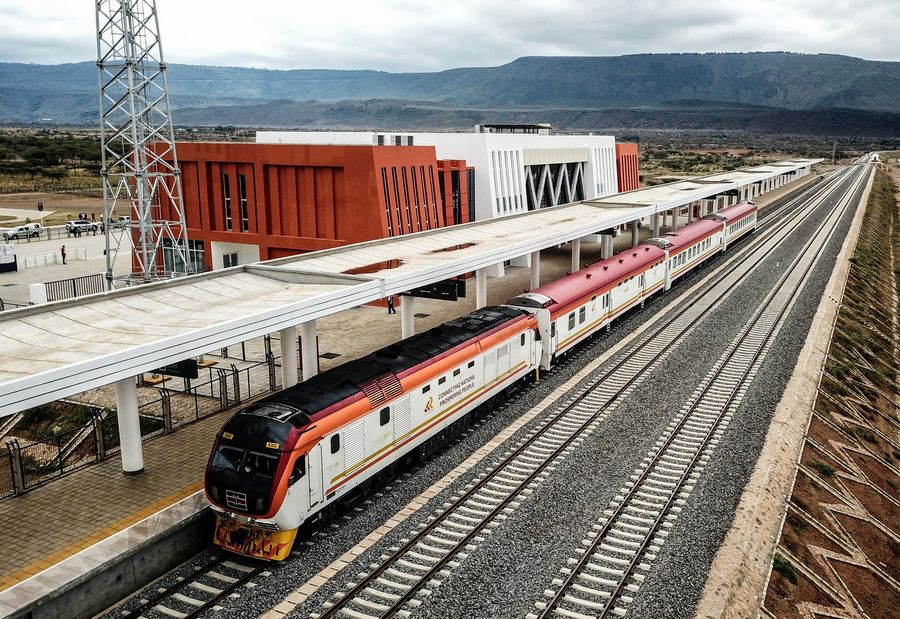 A test train arrives at Mai Mahiu station in Kenya, Sept. 10, 2019. Construction of Standard Gauge Railway (SGR) phase 2A project linking Kenya's capital Nairobi to the resort town of Naivasha has entered the final phase.(Xinhua/Zhang Yu)