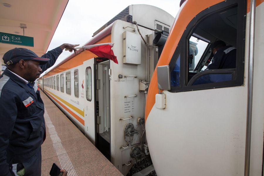 A test train heads back under a staff member's instruction at Suswa station in Kenya, Sept. 10, 2019. Construction of Standard Gauge Railway (SGR) phase 2A project linking Kenya's capital Nairobi to the resort town of Naivasha has entered the final phase. (Xinhua/Zhang Yu)