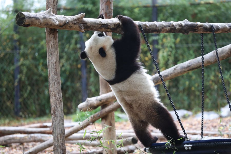 Giant panda Tian Bao plays at Pairi Daiza zoo in Brugelette, Belgium, Sept. 25, 2019. Hao Hao gave birth to him on June 2, 2016, a historic first for Belgium. (Xinhua/Zhang Cheng)