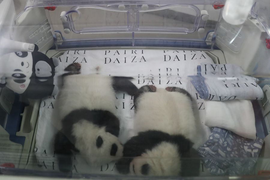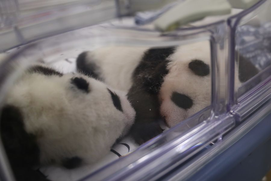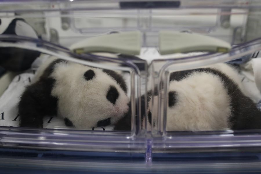 Photo taken on Sept. 25, 2019 shows the twin panda cubs at Pairi Daiza zoo in Brugelette, Belgium. Hao Hao gave birth to the two cubs on Aug. 8, 2019.(Xinhua/Zhang Cheng)