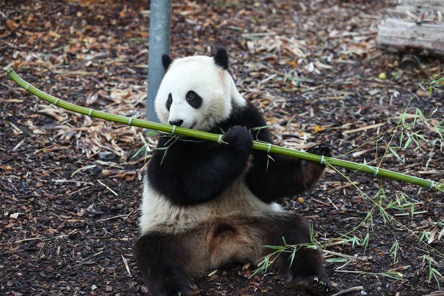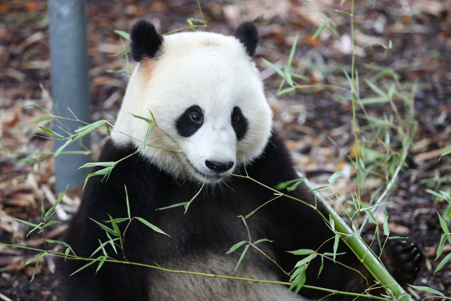 Giant panda Tian Bao eats bamboo branches at Pairi Daiza zoo in Brugelette, Belgium, Sept. 25, 2019.(Xinhua/Zhang Cheng)