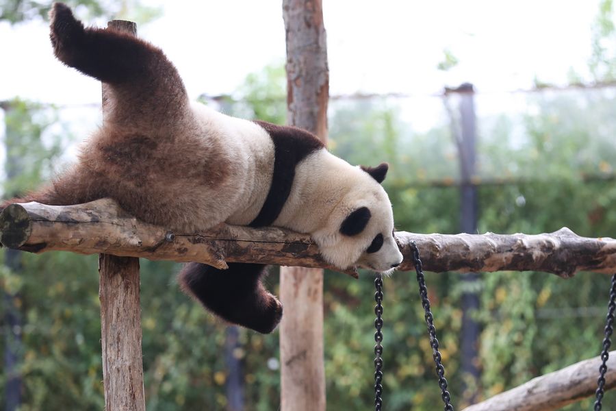Giant panda Tian Bao plays at Pairi Daiza zoo in Brugelette, Belgium, Sept. 25, 2019.(Xinhua/Zhang Cheng)
