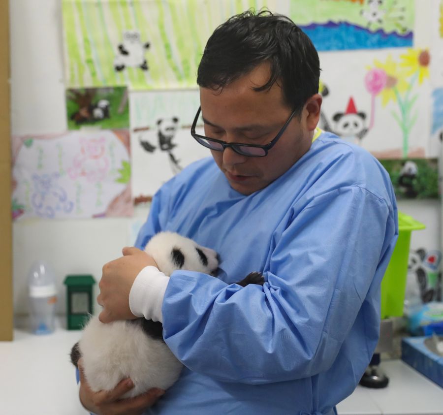 A breeder takes care of a panda cub at Pairi Daiza zoo in Brugelette, Belgium, Sept. 25, 2019.(Xinhua/Zhang Cheng)■