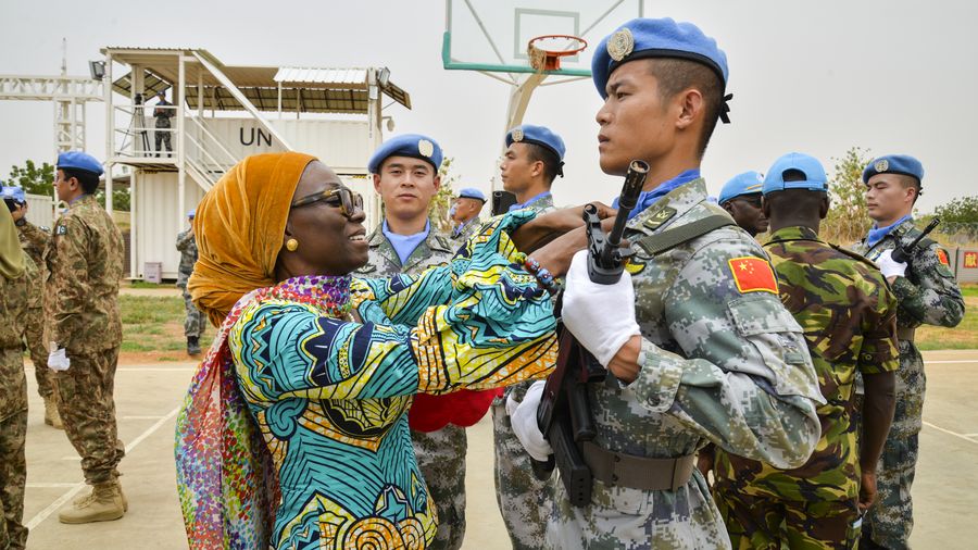Anita Kiki Gebe, deputy joint special representative of the United Nations-African Union Mission in Darfur (UNAMID), awards UN peace medal to a soldier of the 2nd China Medium Utility Helicopter Unit (CMUHU02) in El-Fashir, Sudan, July 17, 2019. The 140 officers and soldiers of the 2nd China Medium Utility Helicopter Unit (CMUHU02), a peacekeeping contingent to Sudan's Darfur, were awarded UN peace medals. (Xinhua)