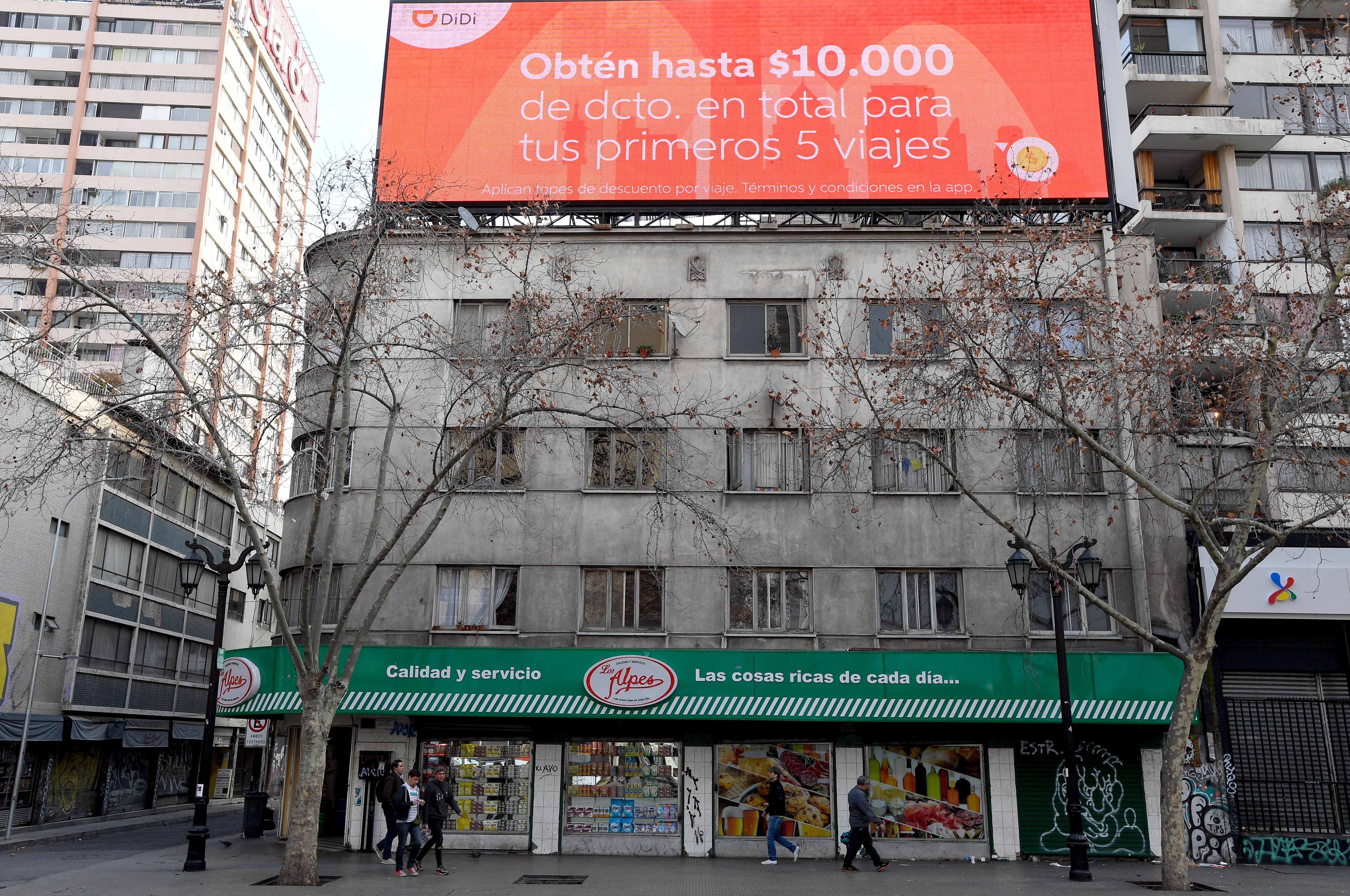 People rest in front of an advertising poster of the Chinese transport company DiDi Chuxing, in the city of Santiago, capital of Chile, on Aug. 6, 2019.(Xinhua/Jorge Villegas)