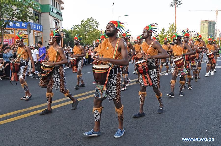 Artists perform on the street in Nanfeng County, east China's Jiangxi Province, Sept. 27, 2019. The opening ceremony of a cultural week event featuring mask dances was held here on Friday to display and study the mask cultures of China and the world. (Xinhua/Wan Xiang)