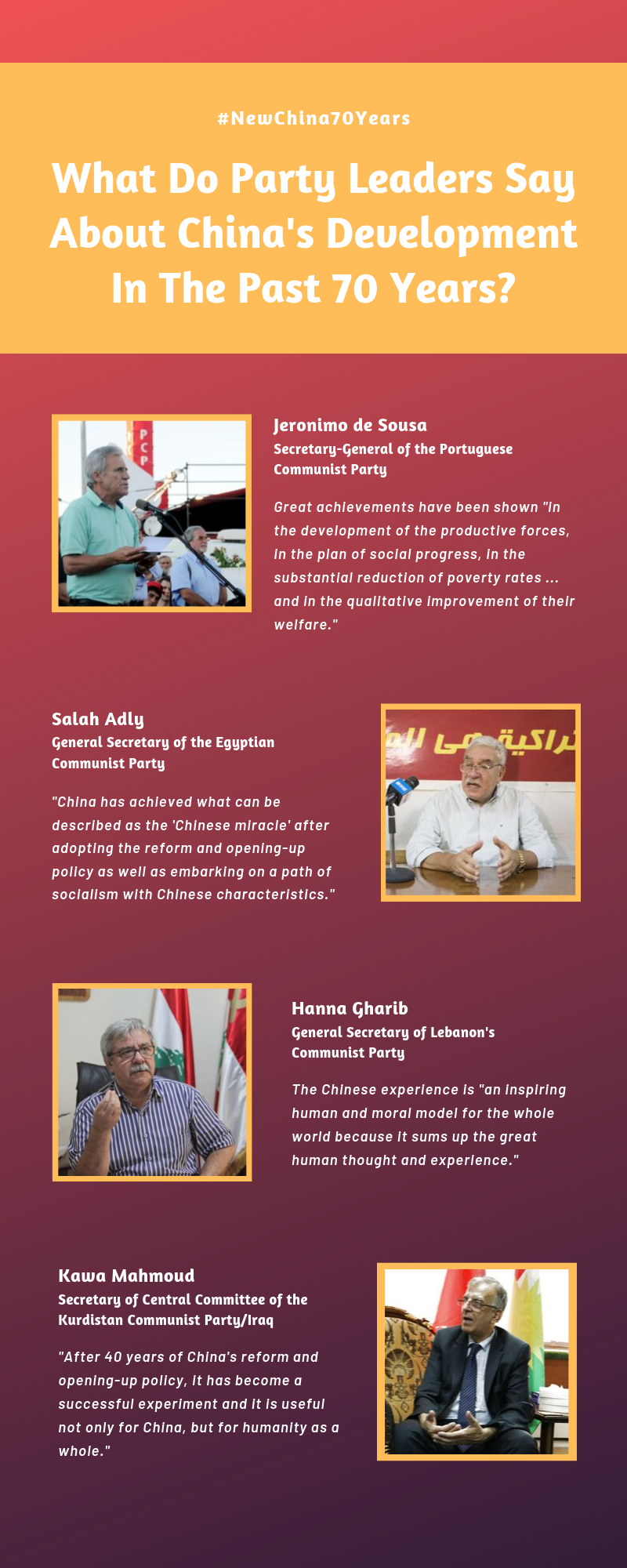 BEIJING, Sept. 30 (Xinhua) -- As the People's Republic of China is about to celebrate its 70th founding anniversary, Communist Party leaders from Portugal, Egypt, Lebanon and Iraq express their view on China's development #PRC70Years Read More: xhne.ws/Tig7V xhne.ws/PasuN xhne.ws/Q1Uxc xhne.ws/rt4CZ ■