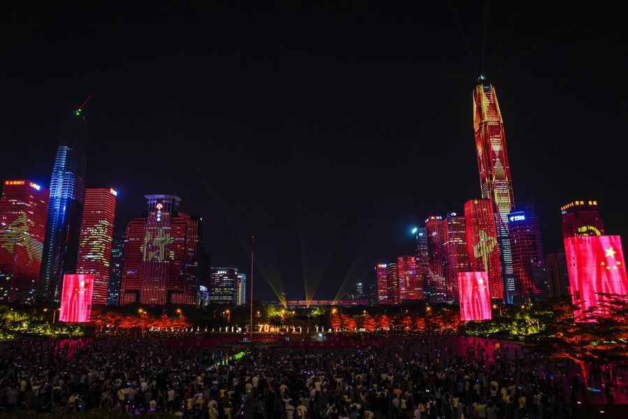 Photo taken on Sept. 24, 2019 shows a light show celebrating the 70th anniversary of the founding of the People's Republic of China in Futian District of Shenzhen, south China's Guangdong Province. The light show will last until Oct. 15. (Xinhua/Mao Siqian)
