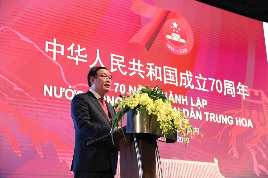 Vietnamese Deputy Prime Minister Vuong Dinh Hue, also a member of the Political Bureau under the Communist Party of Vietnam Central Committee, delivers a speech at a reception to celebrate the 70th anniversary of the founding of the People's Republic of China in Hanoi, Vietnam, Sept. 26, 2019. (Xinhua/Wang Di)