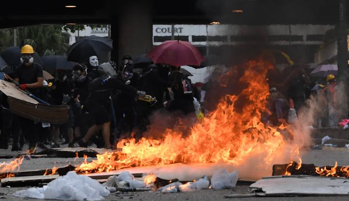 Some rioters hurled multiple petrol bombs at police officers, along with other objects. Some mistakenly landed on other protesters' umbrellas.