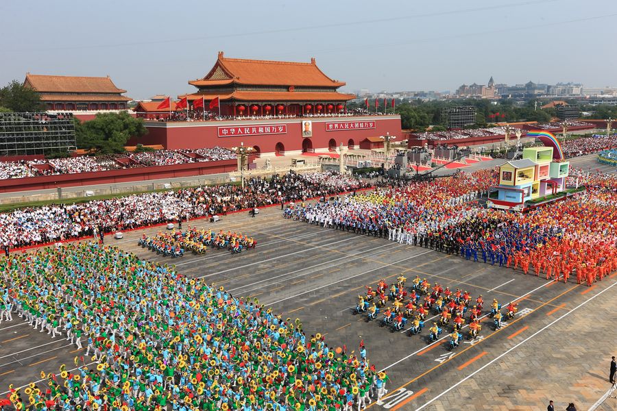 People take part in a mass pageantry during the celebrations marking the 70th anniversary of the founding of the People's Republic of China (PRC) in Beijing, capital of China, Oct. 1, 2019. (Xinhua/Ju Zhenhua)