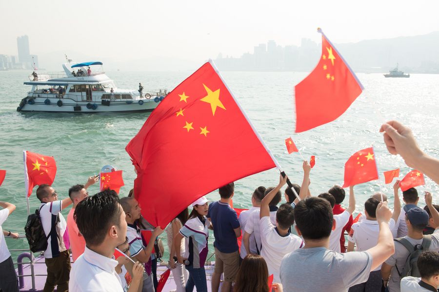 People celebrate 70th anniversary of the founding of the People's Republic of China (PRC) on a ship at the Victoria Harbor in south China's Hong Kong, Oct. 1, 2019. (Xinhua)