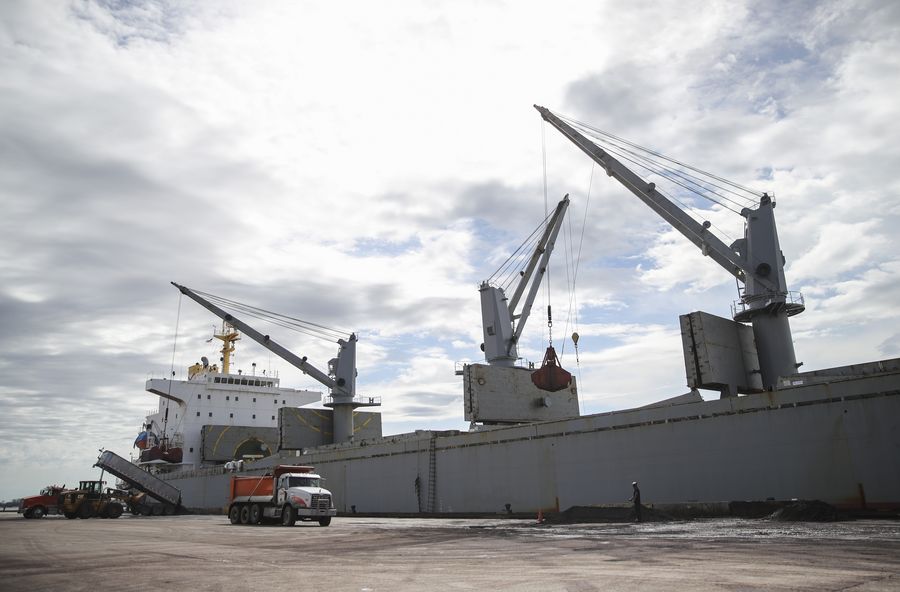 A cargo ship loads mineral products at a harbor in the Port of South Louisiana in the southeastern U.S. state of Louisiana, Feb. 27, 2019. (Xinhua/Wang Ying)
