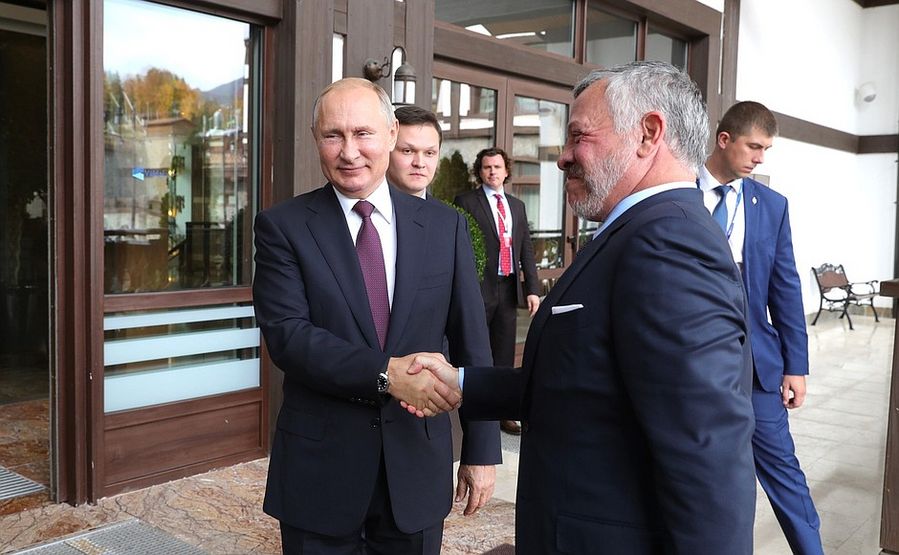 Russian President Vladimir Putin shakes hands with King Abdullah II of Jordan in Sochi, Russia, Oct. 3, 2019. (Kremlin Photo)
