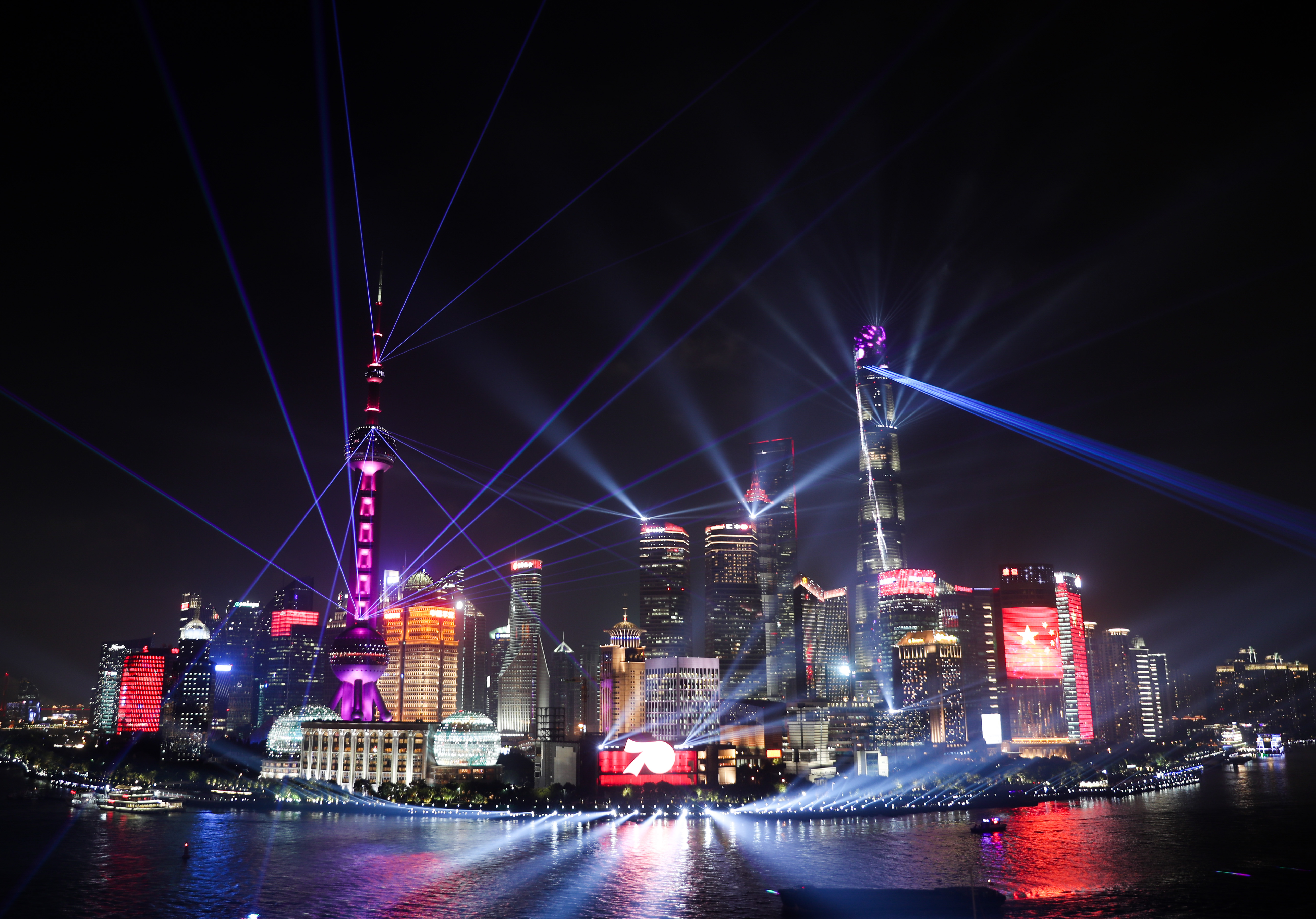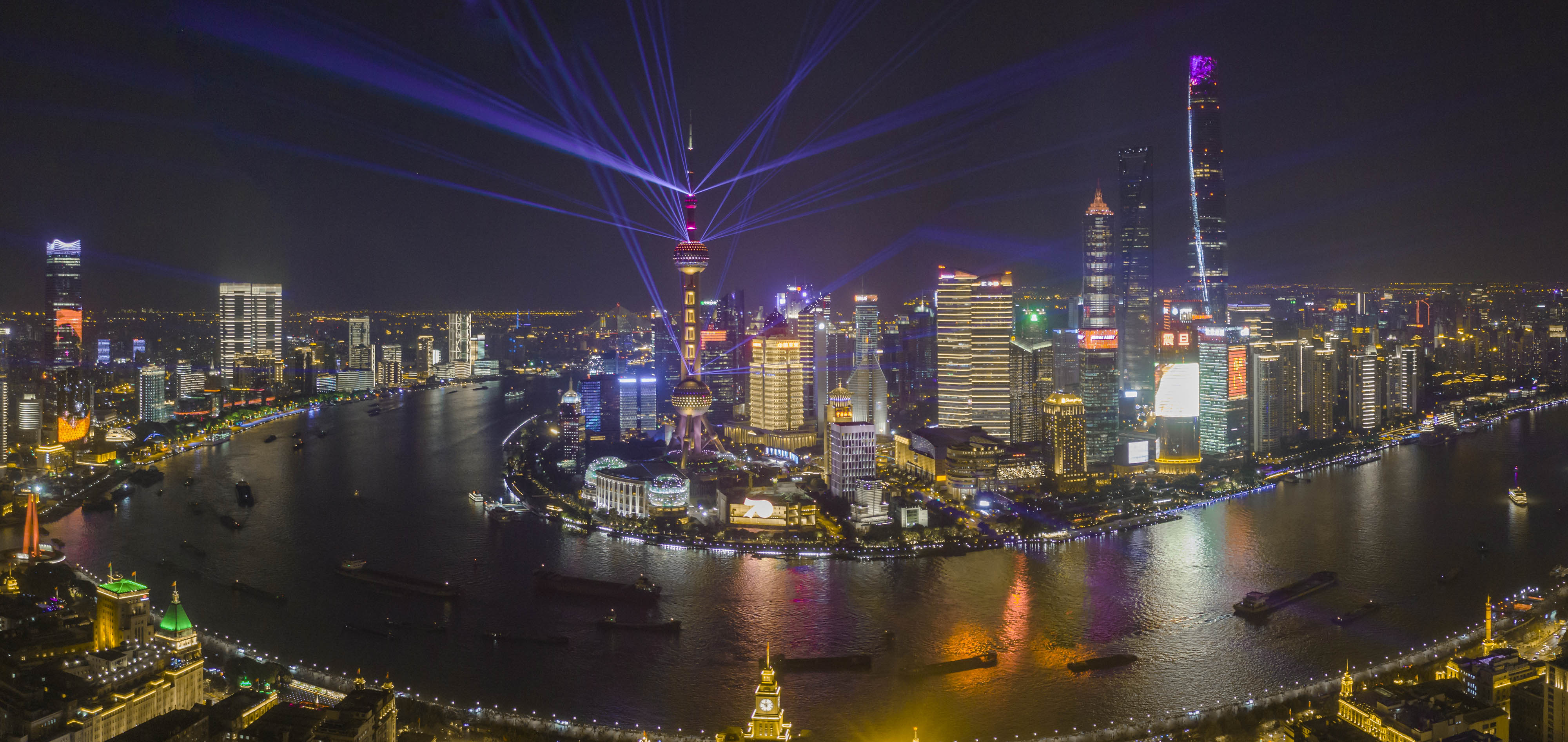 A light show at Lujiazui area in Pudong District of east China's Shanghai. (Xinhua/Ren Long)