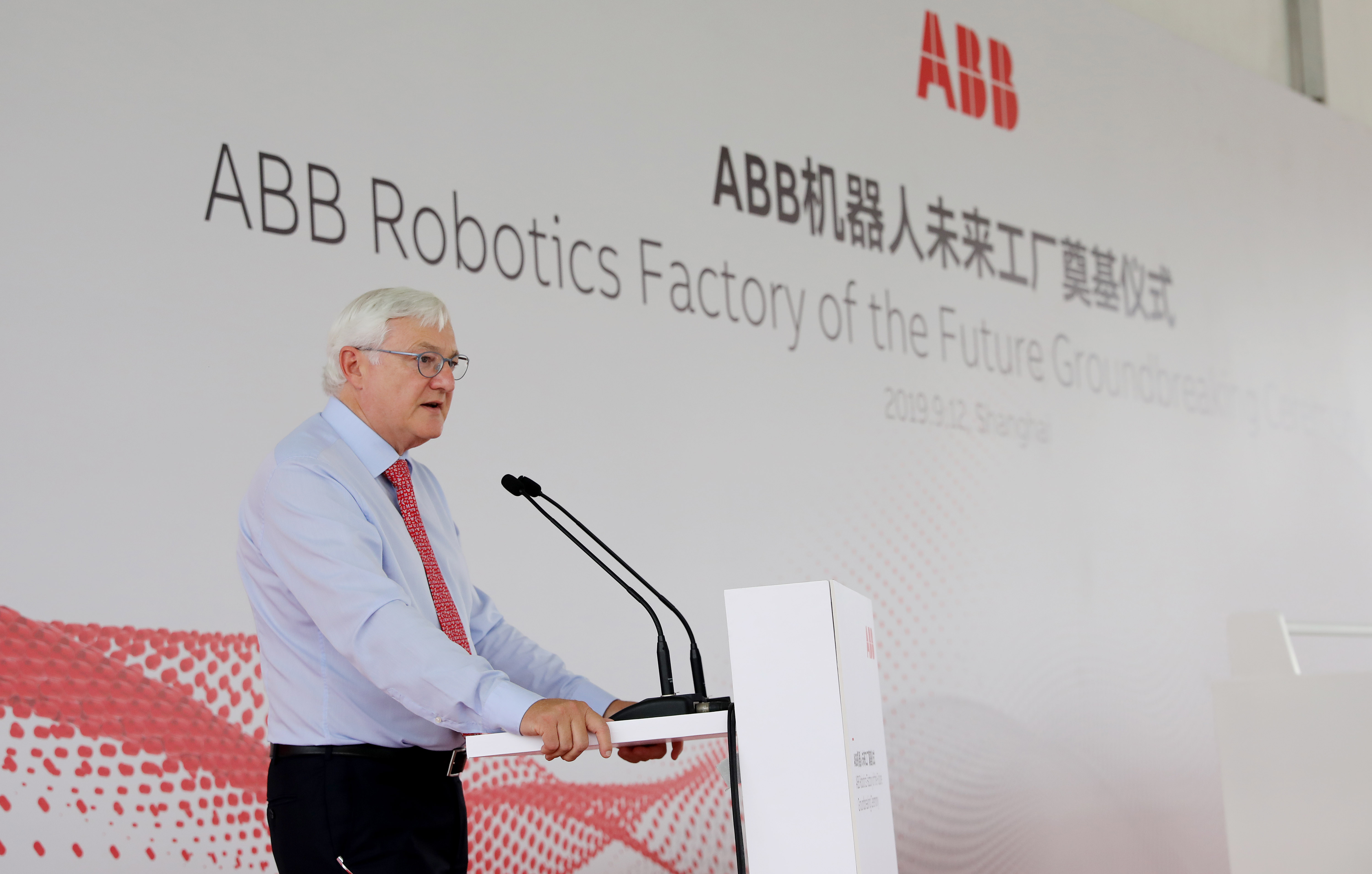 Peter Voser, Chairman and CEO of ABB, speaks during the groundbreaking ceremony of ABB Robotics Factory of the Future in Shanghai, east China, Sept. 12, 2019. (Xinhua/Fang Zhe)