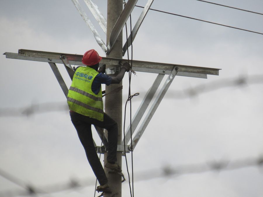 A South Sudanese youth climbs a pole to connect electric cables in Juba, South Sudan on April 15, 2019. Majority of young South Sudanese are employed by a Chinese electricity firm, China Power, a firm contracted by the government to build its power poles.(Xinhua/Daniel Majack)