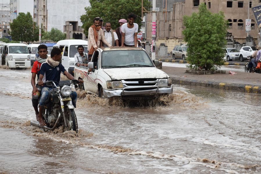 Vehicles run on a flooded street after heavy rainfall in Aden city, Yemen, Sept. 27, 2019. (Photo by Murad Abdo/Xinhua)