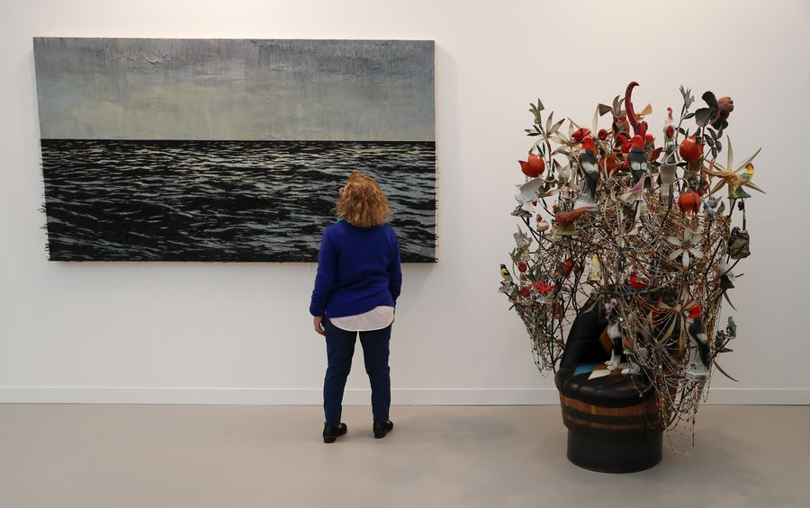 A man views an artwork at the Frieze London art fair in London, Britain. (Xinhua/Han Yan)