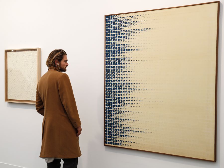 A man views artworks at the Frieze London art fair in London, Britain on Oct. 4, 2019. Frieze London, an international contemporary art fair, runs from Oct. 3 to 6, featuring artworks from more than 160 galleries around the world. (Xinhua/Han Yan)