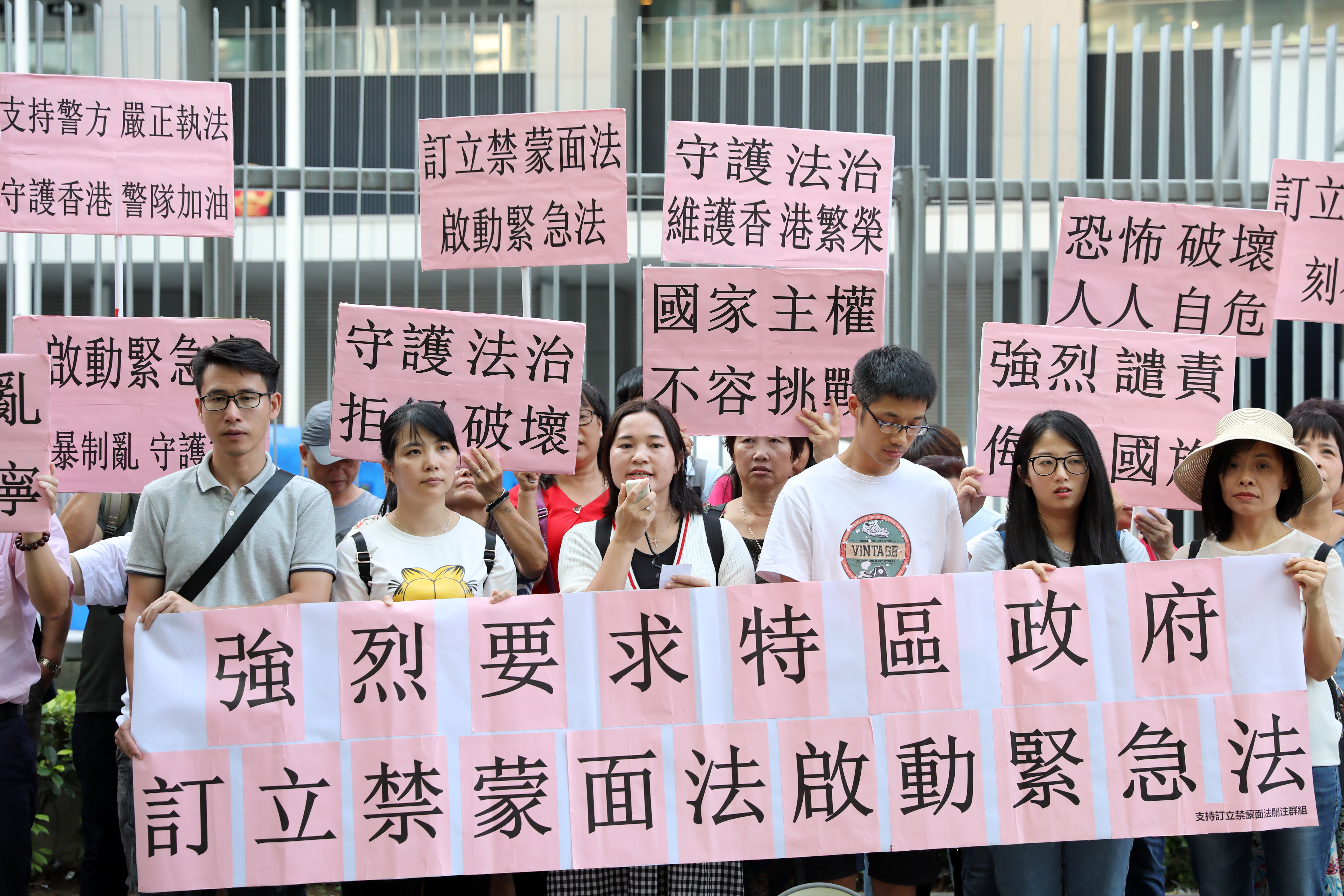 A civil group petitions for establishing the anti-mask law outside the Hong Kong Special Administrative Region government headquarters in Hong Kong, south China, Oct. 3, 2019. (Xinhua/Wu Xiaochu)