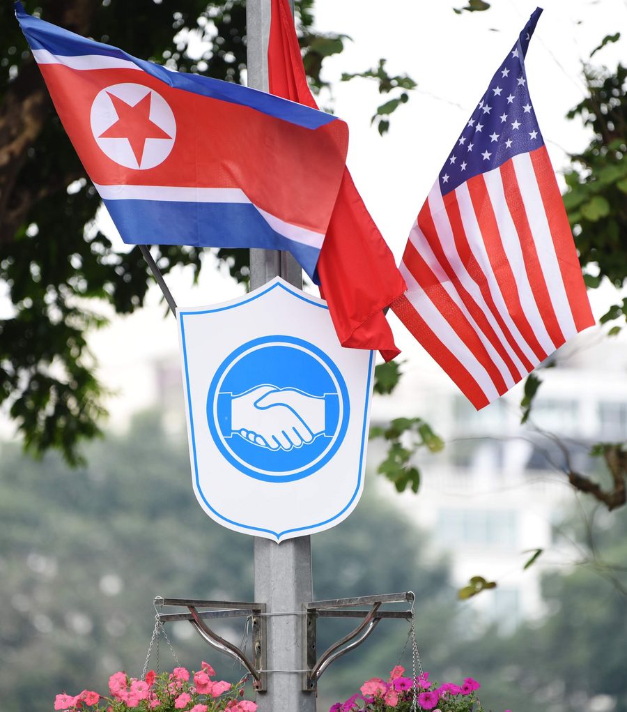 Photo taken on Feb. 25, 2019 shows national flags of Vietnam, the DPRK and the United States in Hanoi, Vietnam. (Xinhua/Wang Shen)