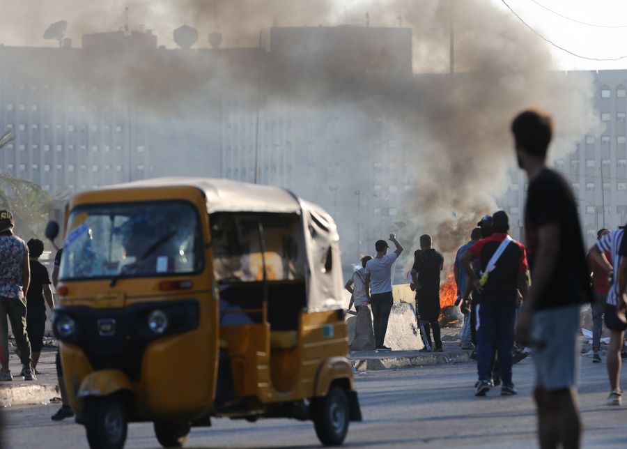 Protesters burn tires during protests in Baghdad, Iraq, on Oct. 5, 2019.(Xinhua/Khalil Dawood)