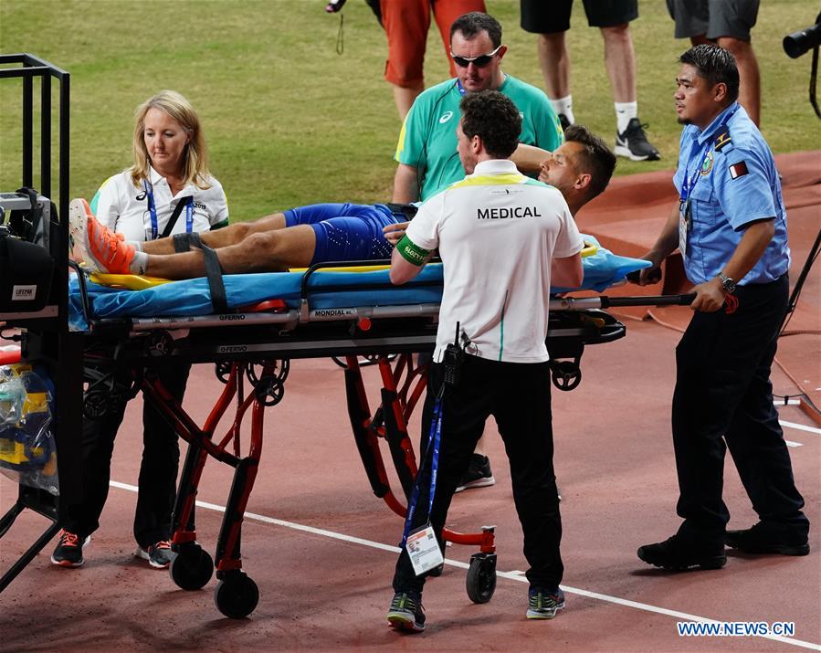 Magnus Kirt of Estonia is treated after injuring during the men's javelin throw at the 2019 IAAF World Athletics Championships in Doha, Qatar, Oct. 6, 2019. (Xinhua/Wang Jingqiang)