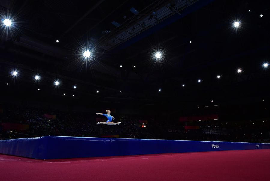 Liliia Akhaimova of Russia competes on the floor exercise during the Women's Qualifications of the 2019 FIG Artistic Gymnastics World Championships in Stuttgart, Germany, Oct. 5, 2019. (Xinhua/Lu Yang)
