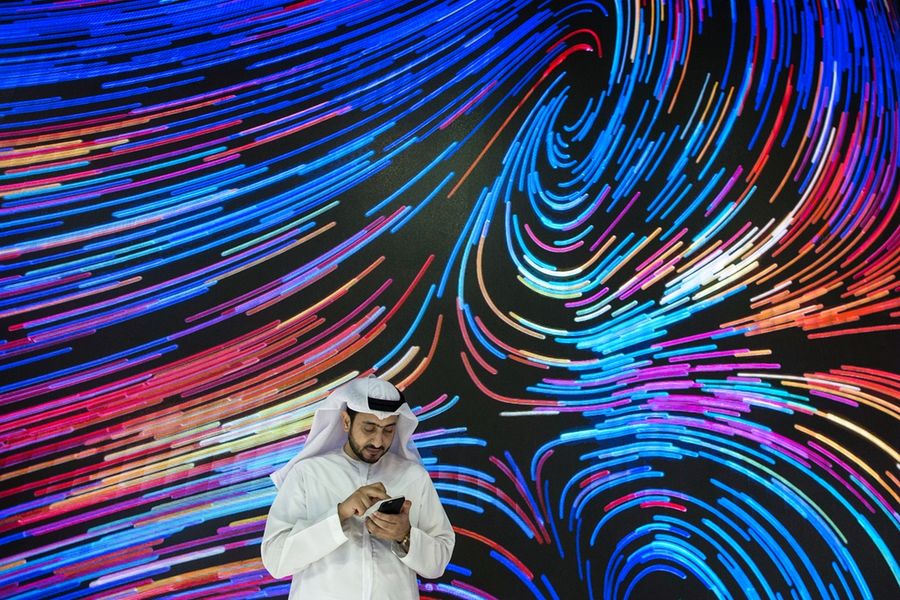 A visitor is seen during the Gulf Information Technology Exhibition (GITEX) in Dubai, the United Arab Emirates, Oct. 6, 2019. Gitex, the largest IT exhibition and conference in the Middle East, kicked off on Sunday at the Dubai World Trade Center, showcasing the latest trends and product innovations across the world. (Photo by Mahmoud Khaled/Xinhua)