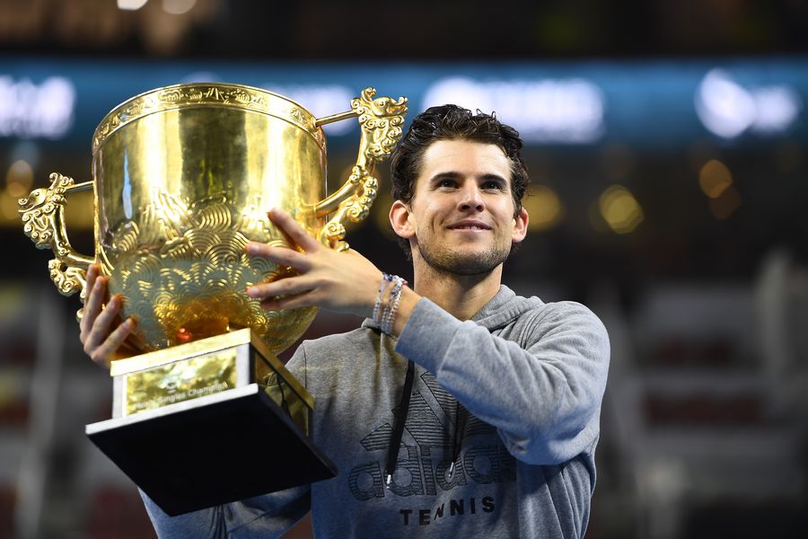 Dominic Thiem of Austria holds up the trophy during the awarding ceremony after the men's singles final match against Stefanos Tsitsipas of Greece at 2019 China Open tennis tournament in Beijing, capital of China, Oct. 6, 2019. (Xinhua/Zhang Hongxiang)
