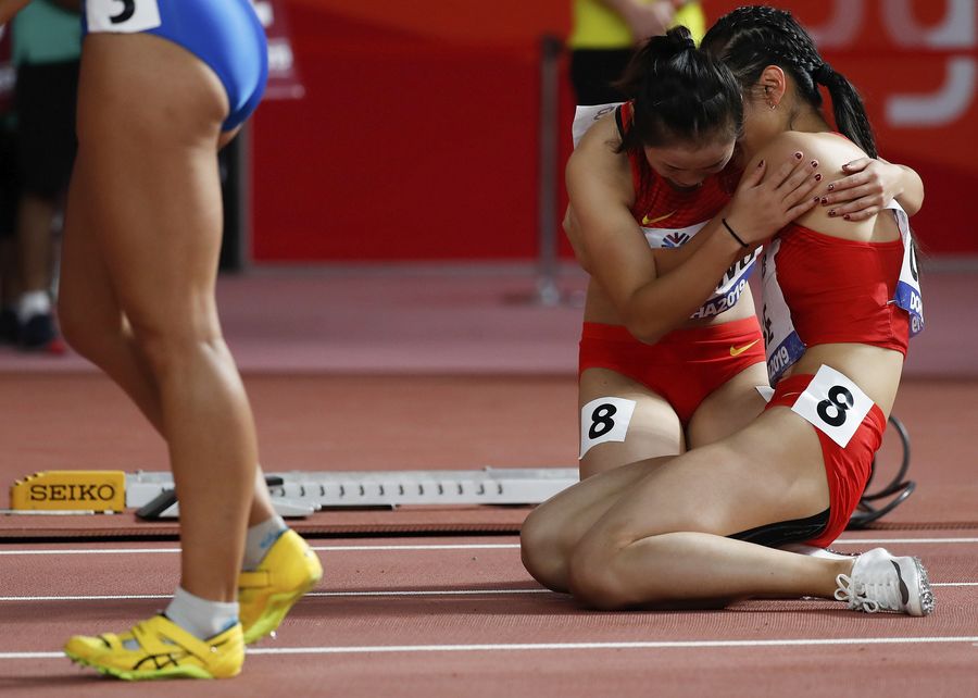 Ge Manqi (R) of Team China is comforted by her teammate Liang Xiaojing after the women's 4X100m relay final at the 2019 IAAF World Athletics Championships in Doha, Qatar, on Oct. 5, 2019. (Xinhua/Wang Lili)