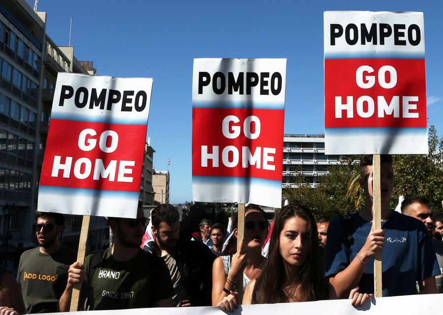 Demonstrators march in front of the Greek Parliament holding banners against the U.S. Secretary of State Mike Pompeo in Athens, Greece, on Oct. 5, 2019. Visiting U.S. Secretary of State Mike Pompeo met with demonstrations here on Saturday after he signed an updated agreement in defense with the Greek government. (Xinhua/Marios Lolos)