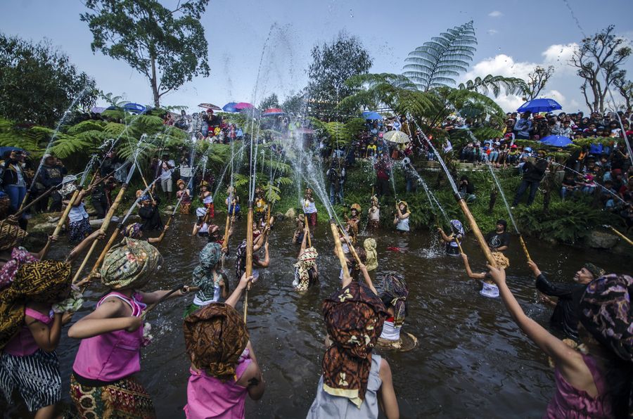 People splash water with bamboo pumps to celebrate the spring water preserving tradition at Lembang in Bandung, West Java, Indonesia, Oct. 6, 2019. (Photo by Septianjar/Xinhua)