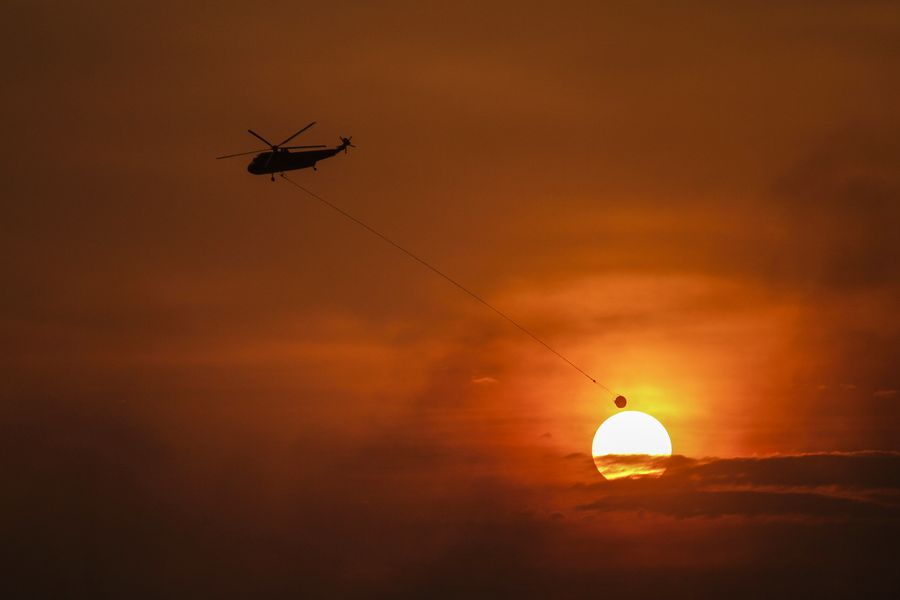 A water bombing helicopter tries to extinguish a fire in Kampar, Riau, Indonesia, Oct. 6, 2019. (Photo by Hadly Vavaldi/Xinhua)