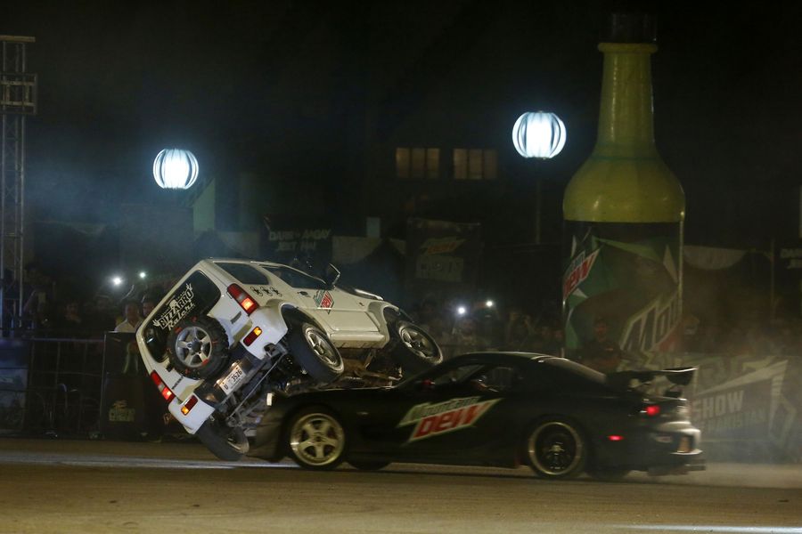Stunt athletes perform during Mountain Dew Moto-Extreme stunt show in Islamabad, capital of Pakistan, Oct. 6, 2019. (Xinhua/Ahmad Kamal)