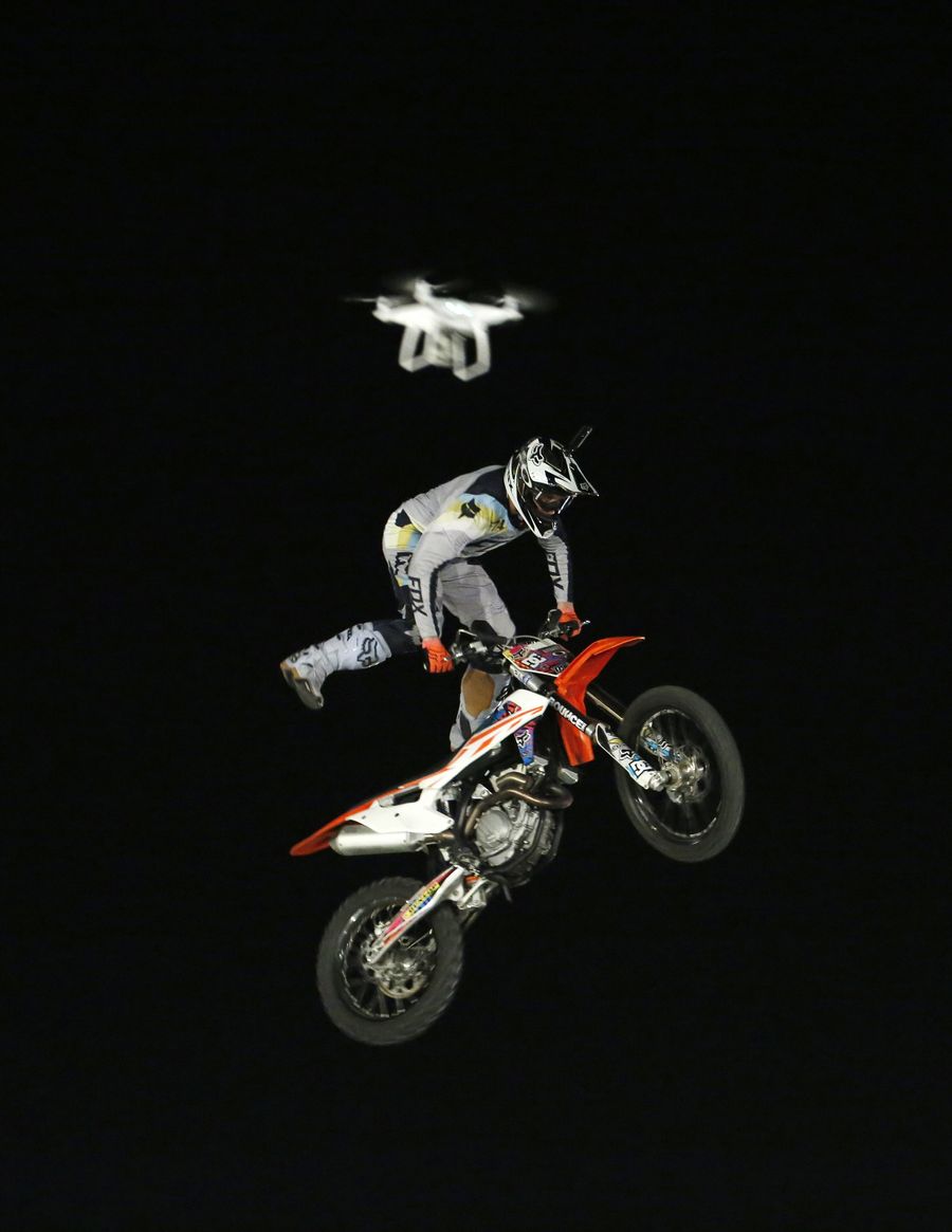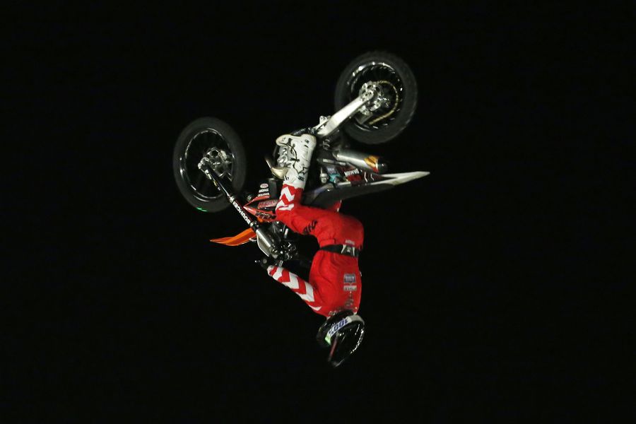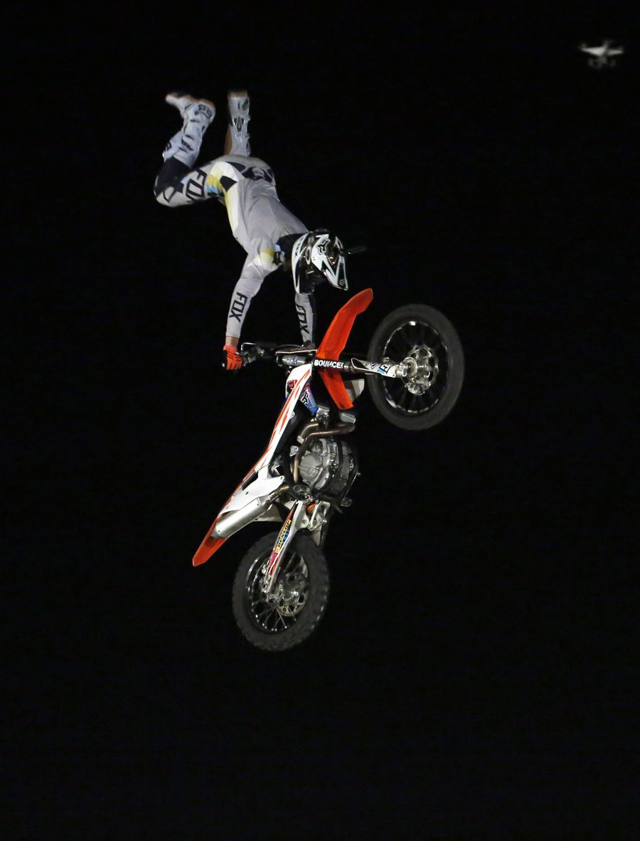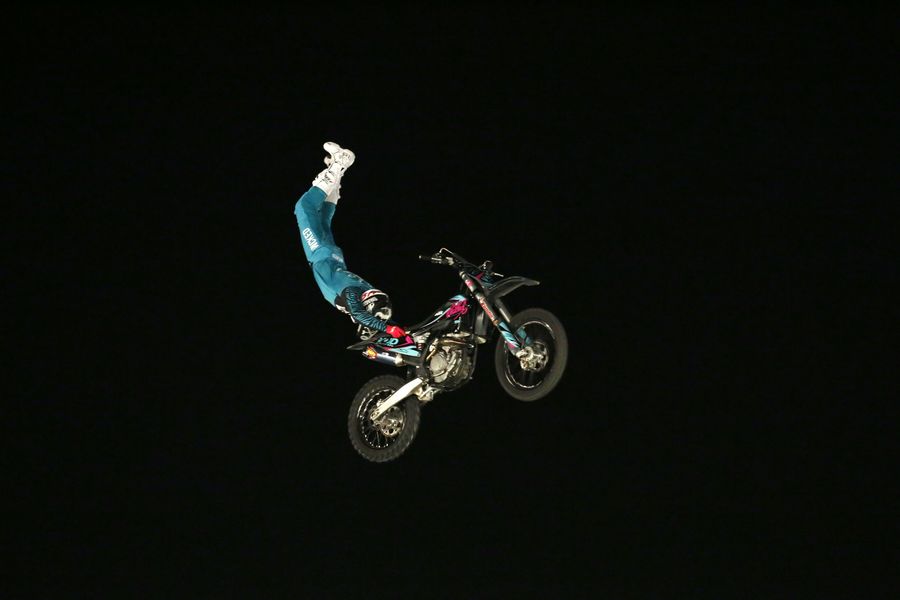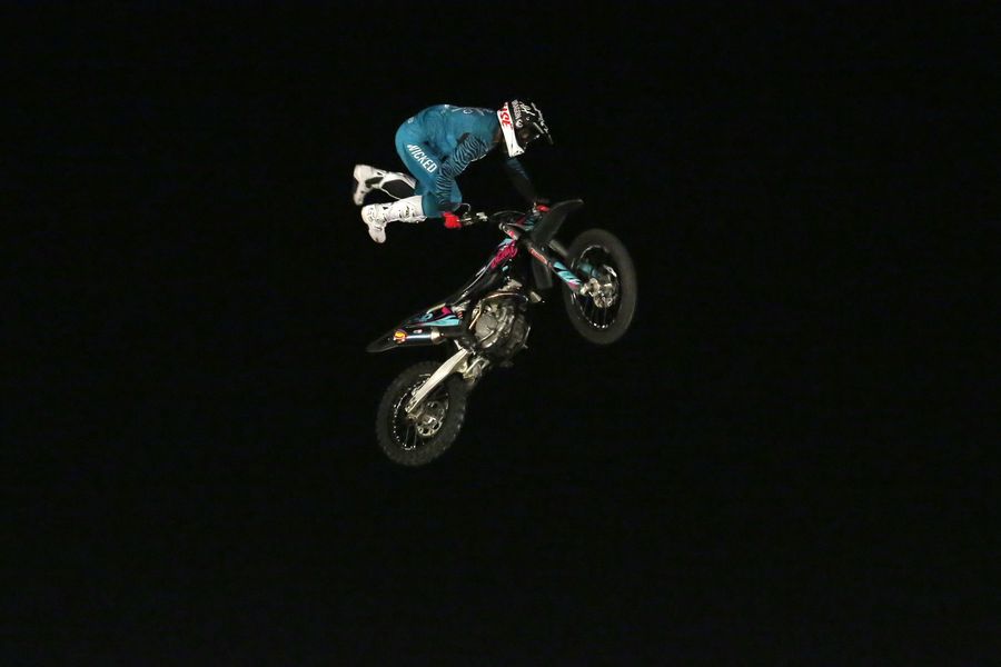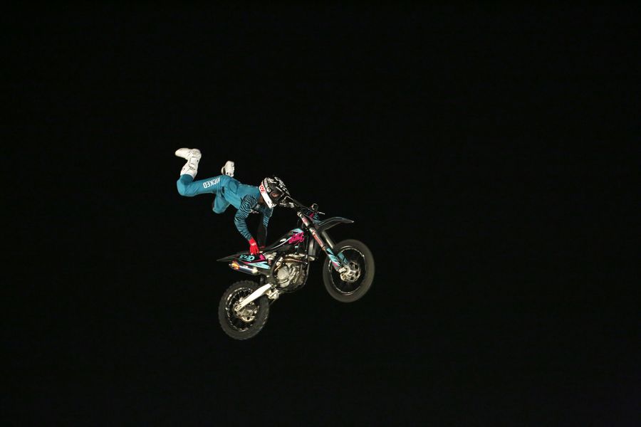 Nick De Witt from South Africa performs a freestyle stunt during Mountain Dew Moto-Extreme stunt show in Islamabad, capital of Pakistan, Oct. 6, 2019. (Xinhua/Ahmad Kamal)