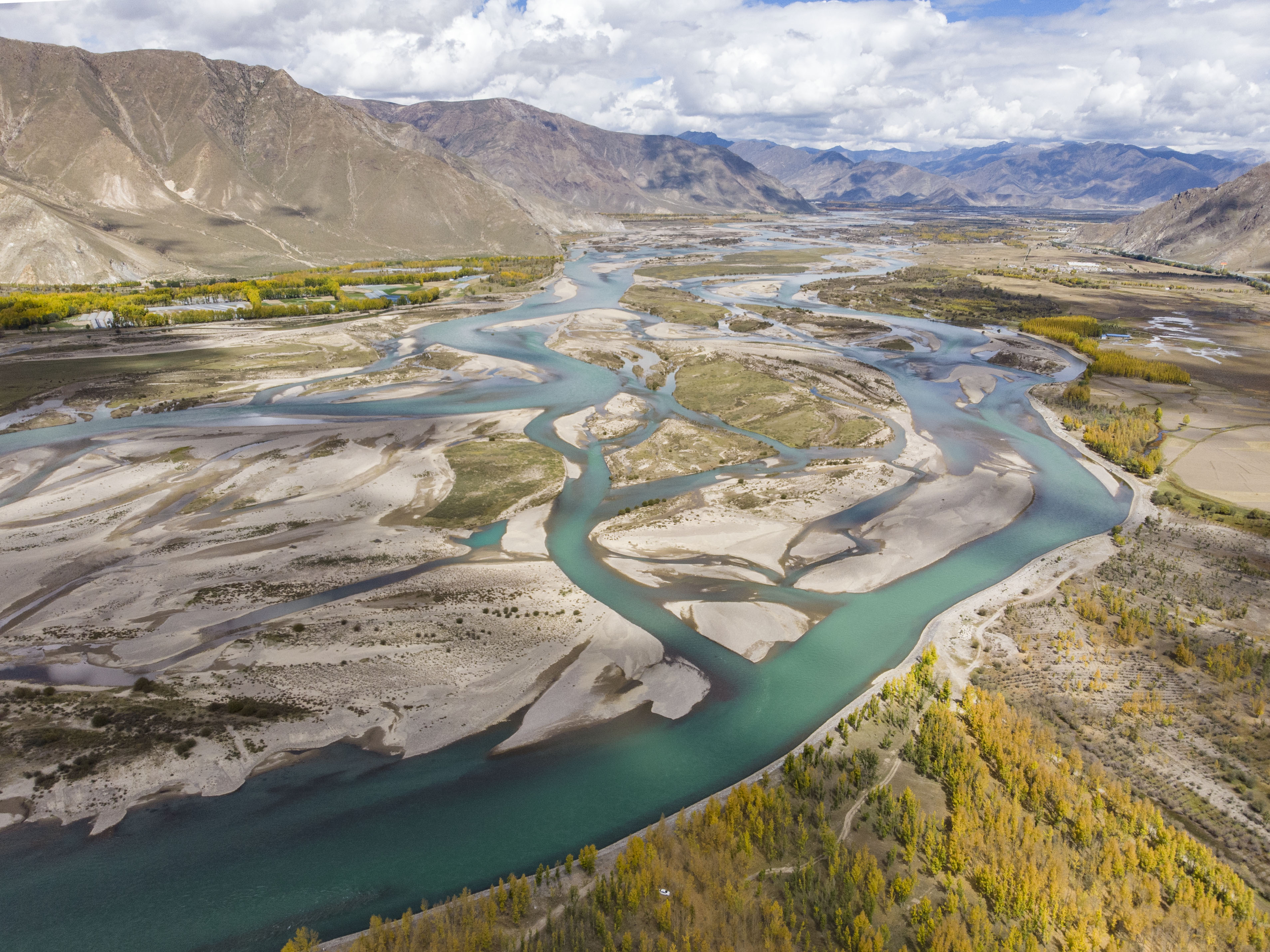 Aerial photo taken on Oct. 7, 2019 shows a view of the Lhasa River valley in Lhasa, southwest China's Tibet Autonomous Region. (Photo by Sun Fei/Xinhua)