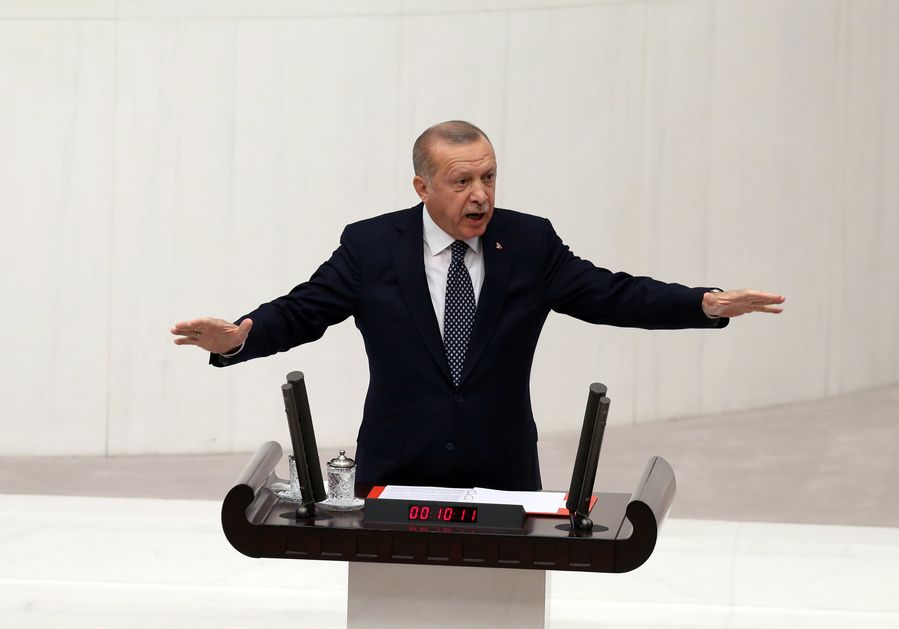 Turkish President Recep Tayyip Erdogan speaks at the opening ceremony of the new legislative year of the Turkish parliament in Ankara, Turkey, on Oct. 1, 2019. He revealed for the first time the plans for resettling 2 million people in the safe zone to be built in northern Syria. (Xinhua/Mustafa Kaya)