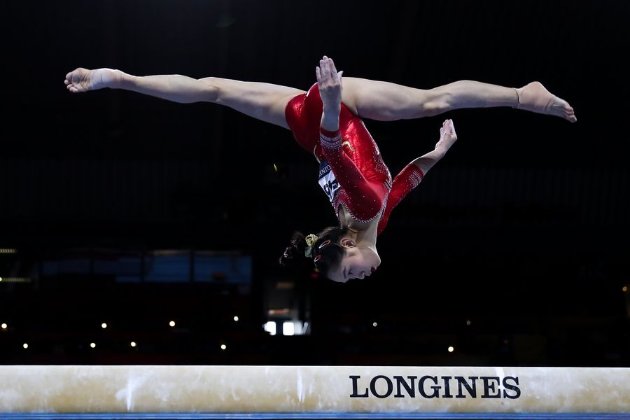 Liu Tingting of China competes on the balance beam during the Women's Team Final of the 2019 FIG Artistic Gymnastics World Championships in Stuttgart, Germany, Oct. 8, 2019. (Xinhua/Zhang Cheng)