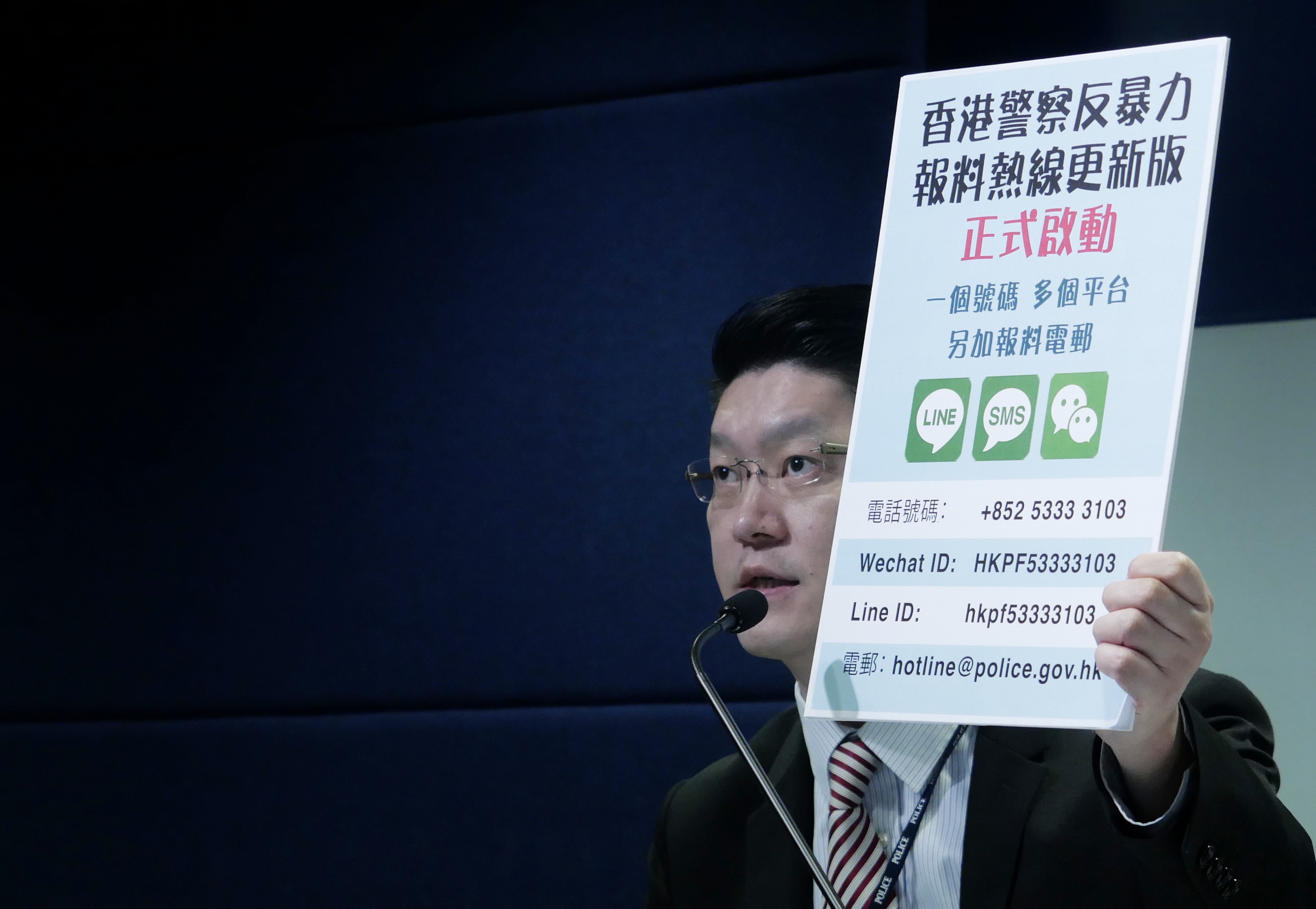 Senior Superintendent Chan Chi-yung of Information Systems Wing of the Hong Kong Police Force displays new anti-violence hotlines at a media briefing in south China's Hong Kong, Oct. 8, 2019. (Xinhua/Wang Shen)