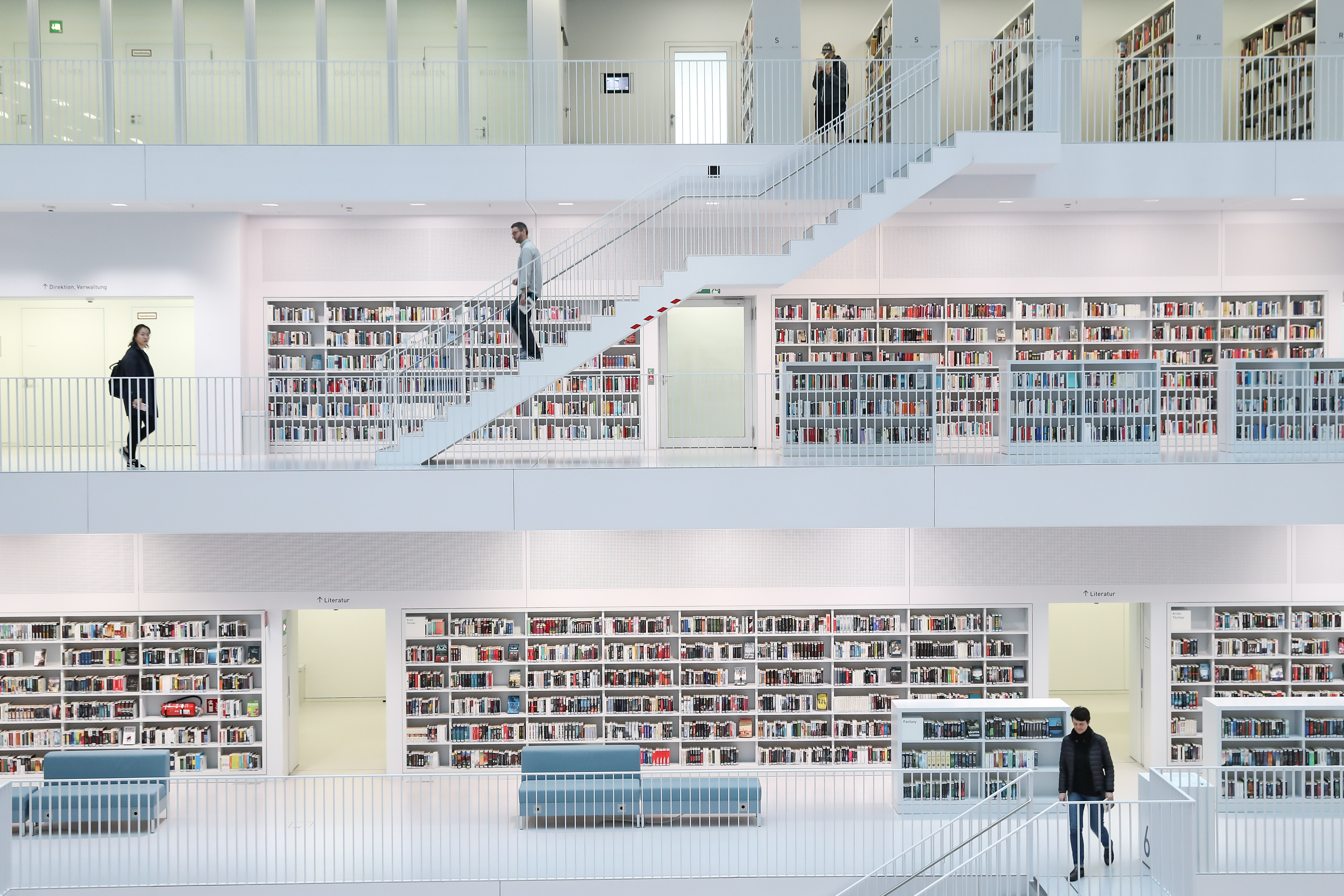 Photo shows the interior view of the Stuttgart Municipal Library in Stuttgart, Germany on Oct. 8, 2019. Opening in 2011, the Stuttgart Municipal Library has become the city's new cultural center as well as a tourist attraction due to its unique design. (Xinhua/Zhang Cheng)