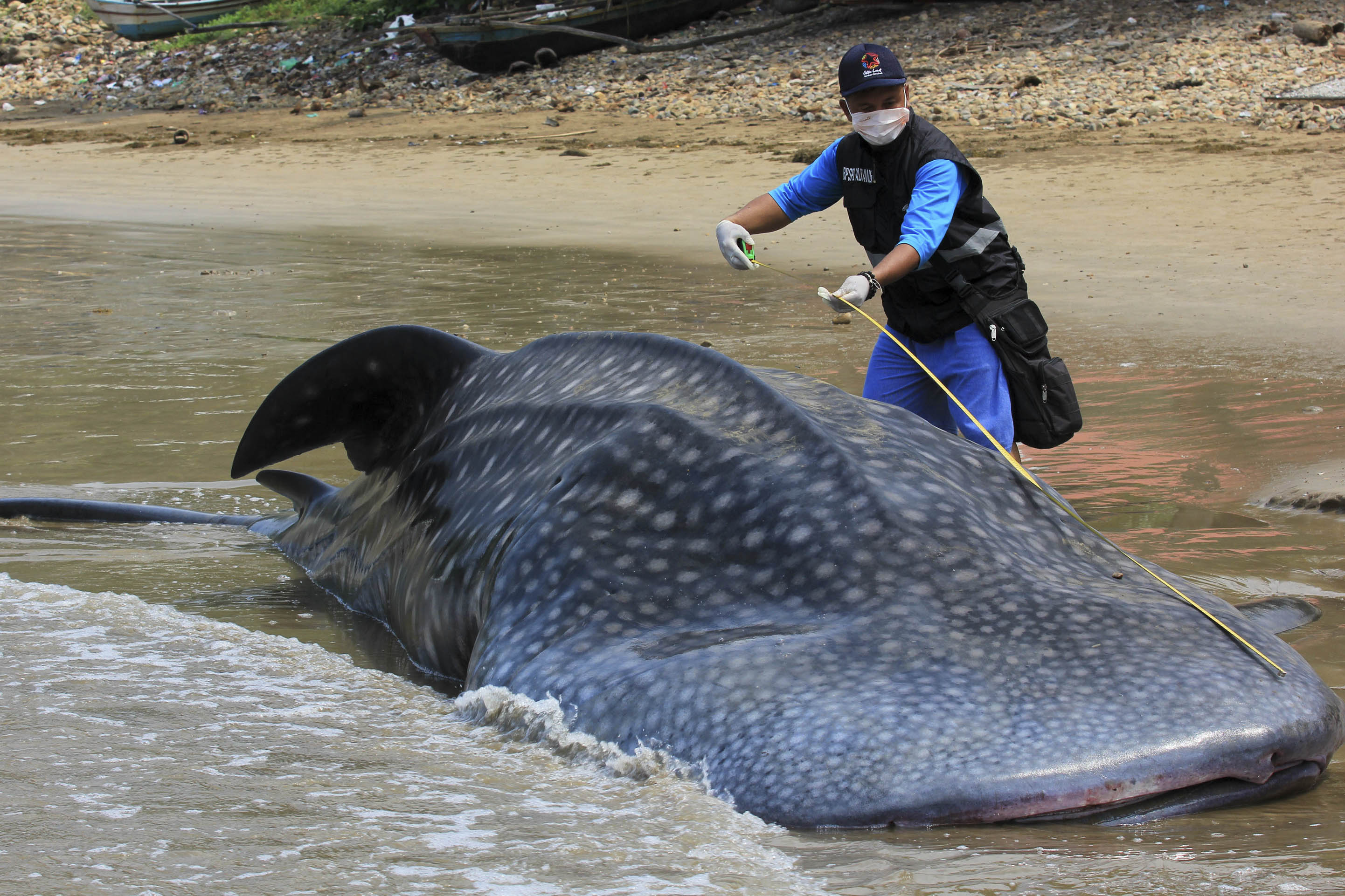 An official measures the length of the body of a dead whale shark stranded at Taluak Batuang beach in West Sumatra, Indonesia, Oct. 8, 2019. (Photo by Andri Mardiansyah/Xinhua)