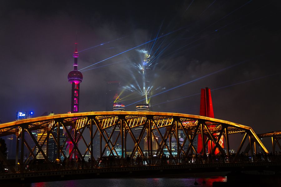A light show is presented during the National Day holiday at the Bund in Shanghai, east China, Oct. 4, 2019. (Xinhua/Zhang Jiansong)