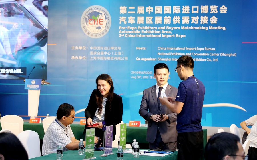 Attendees converse during the Pre-Expo Exhibitors and Buyers Matchmaking Meeting in Automobile Exhibition Area of the second China International Import Expo (CIIE) in Shanghai, Aug. 30, 2019. (Xinhua/Fang Zhe)