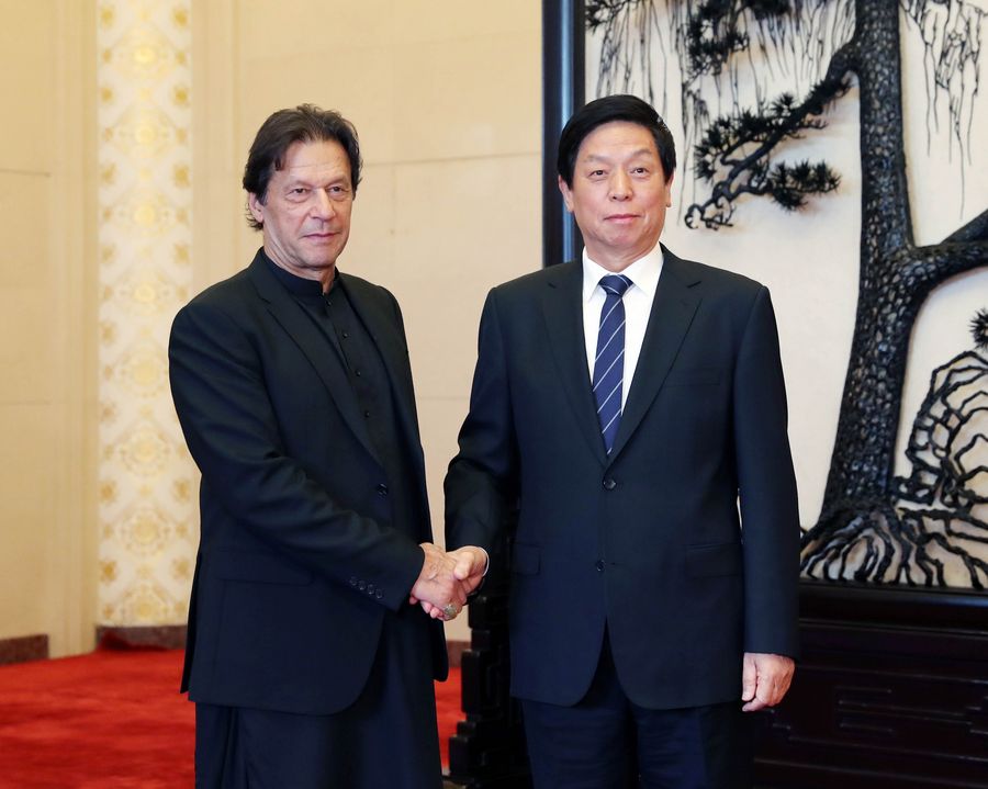 Li Zhanshu, chairman of the Standing Committee of the National People's Congress (NPC), meets with Pakistani Prime Minister Imran Khan at the Great Hall of the People in Beijing, Oct. 9, 2019. (Xinhua/Liu Weibing)