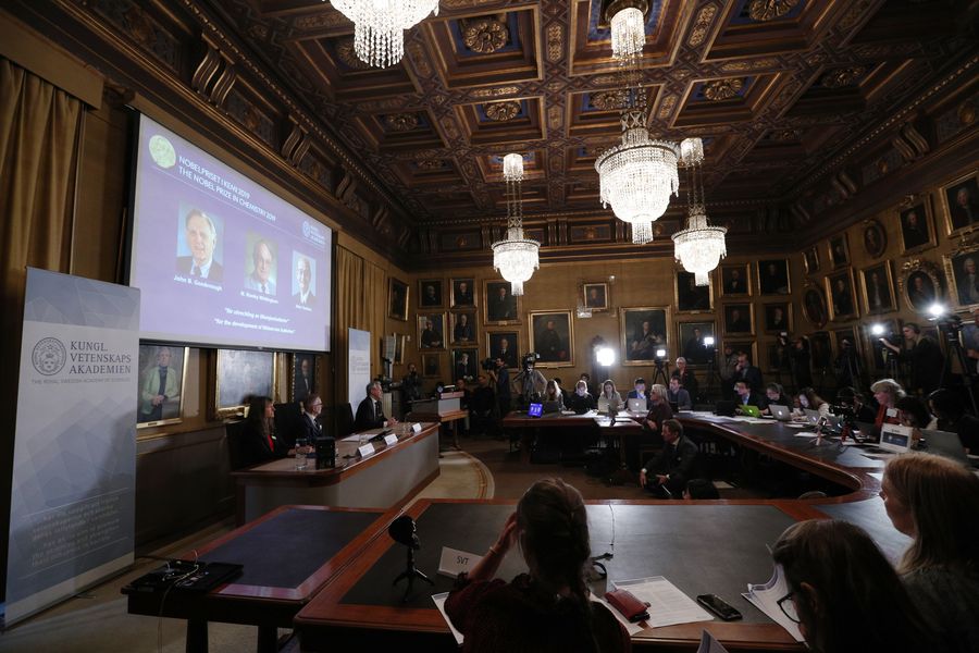Information of the laureates are displayed at the announcement of the 2019 Nobel Prize in Chemistry at the Royal Swedish Academy of Sciences in Stockholm, Sweden, Oct. 9, 2019.(Xinhua/Zheng Huansong)