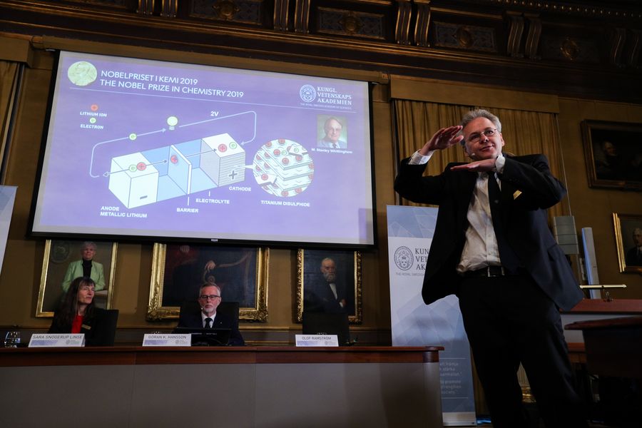 Photo taken on Oct. 9, 2019 shows the announcement of the 2019 Nobel Prize in Chemistry at the Royal Swedish Academy of Sciences in Stockholm, Sweden.(Xinhua/Zheng Huansong)